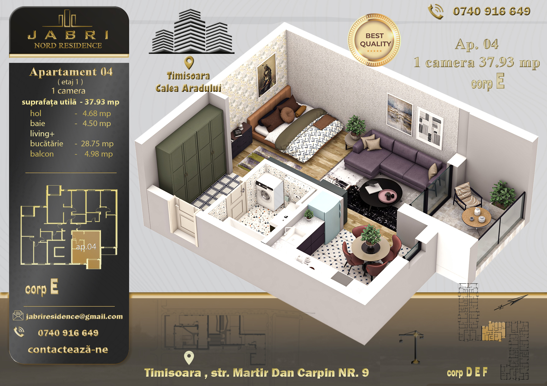 În Jabri Nord Residence, studioul cu 1 cameră este ideal pentru cei care își doresc un stil de viață urban, ordonat și conectat la tot ce contează. Spațiul este inteligent compartimentat, cu o zonă de zi generoasă, bucătărie practică, baie complet utilată și o terasă unde poți evada din ritmul cotidian. Ferestrele mari tip floor to ceiling inundă interiorul cu lumină naturală și creează o atmosferă aerisită și primitoare.