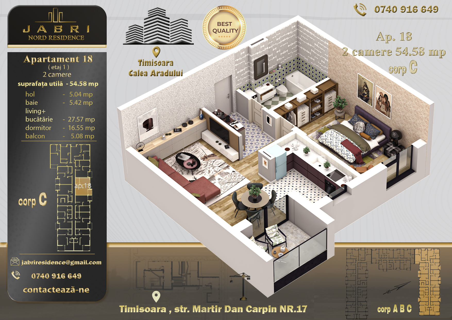 Acest apartament cu 2 camere îmbină perfect funcționalitatea cu confortul. Situat în cadrul Jabri Nord Residence, locuința oferă un living spațios cu deschidere spre o terasă intimă, ideală pentru cafeaua de dimineață sau relaxarea de seară. Dormitorul oferă liniște și intimitate, bucătăria este bine organizată, iar baia impresionează prin finisaje moderne și atenție la detalii.