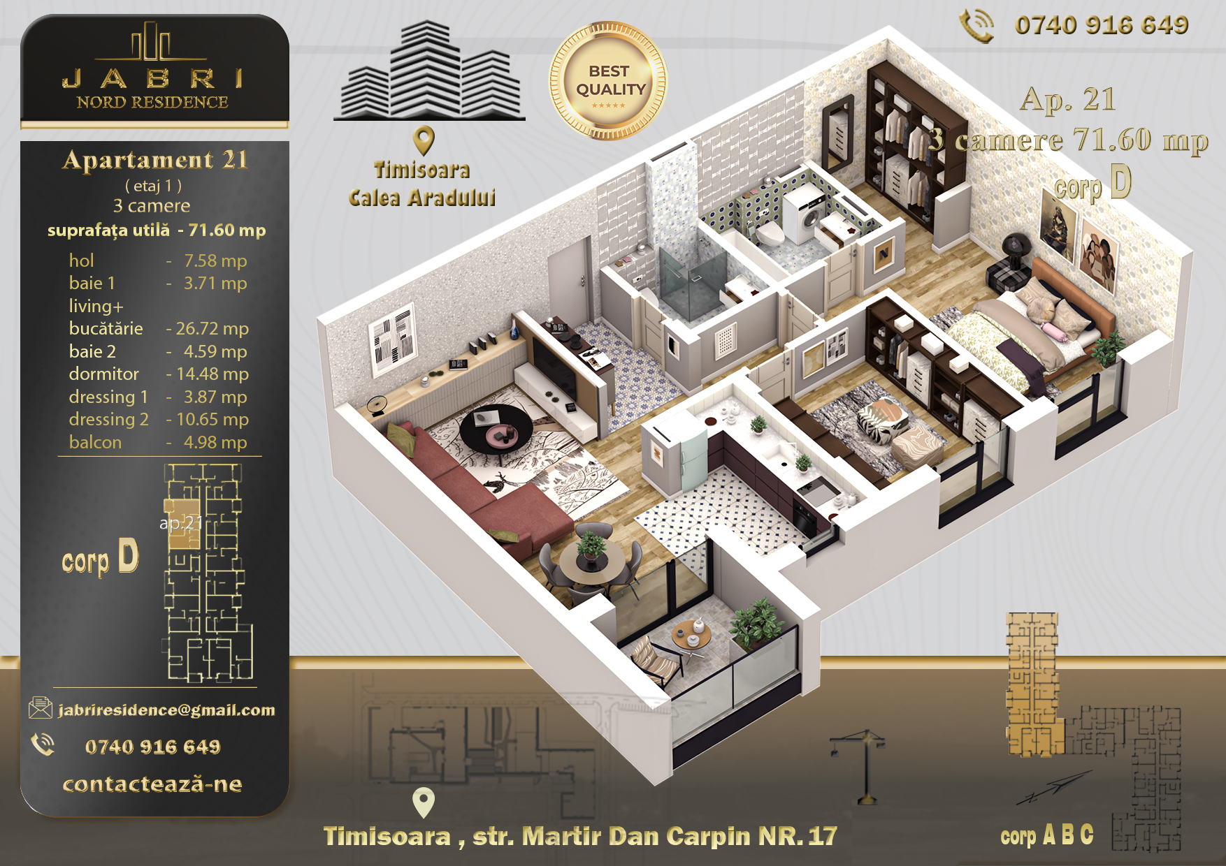 Gândit pentru familii sau pentru cei care își doresc mai mult spațiu, apartamentul cu 3 camere din Jabri Nord Residence te întâmpină cu un ambient generos și luminos. Cele două dormitoare, livingul primitor, bucătăria complet echipată și cele două băi bine gândite îți oferă confortul unei case adevărate. Iar terasa? Un colț de liniște doar al tău, perfect pentru seri în familie sau momente de relaxare la finalul zilei.