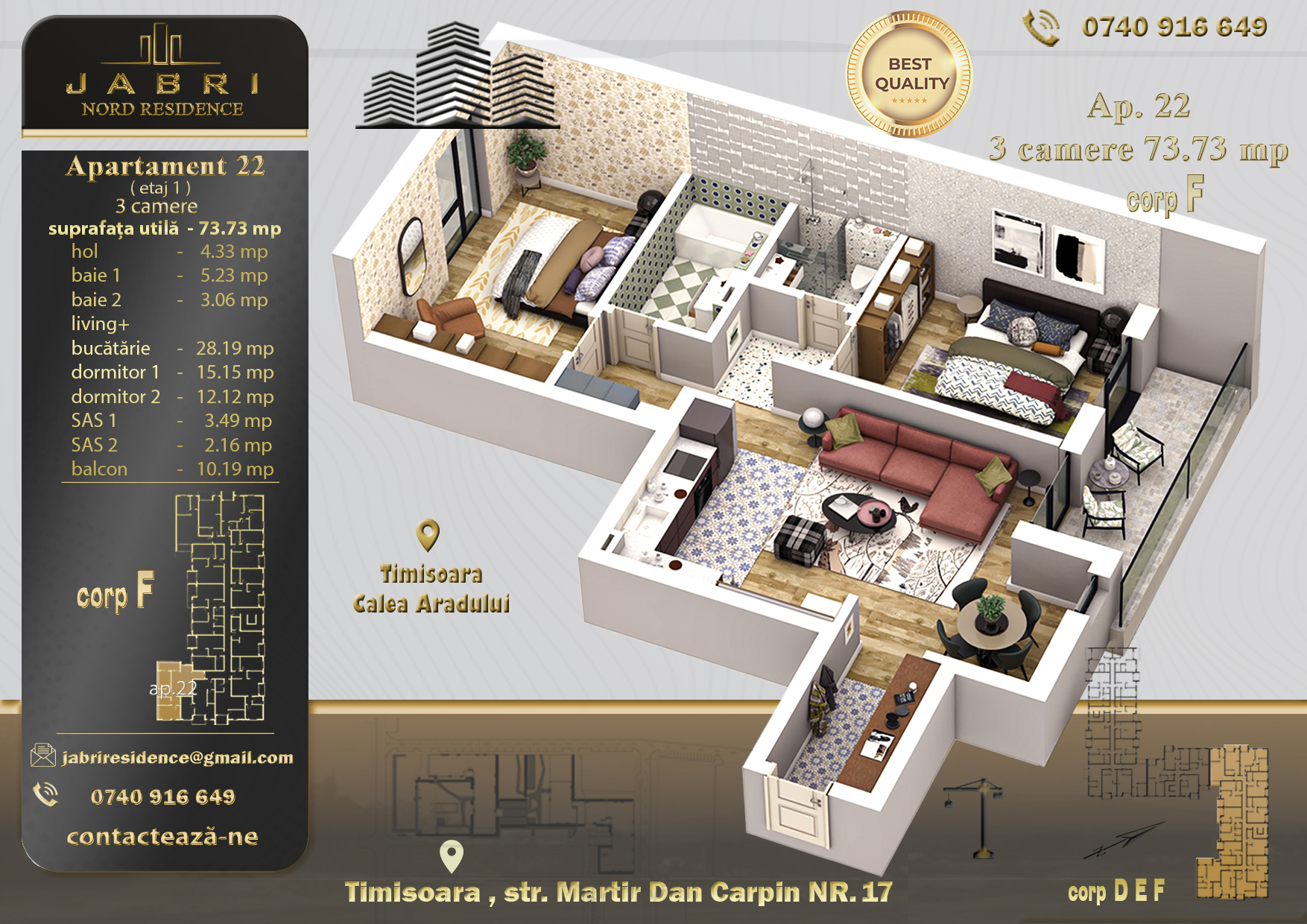 Gândit pentru familii sau pentru cei care își doresc mai mult spațiu, apartamentul cu 3 camere din Jabri Nord Residence te întâmpină cu un ambient generos și luminos. Cele două dormitoare, livingul primitor, bucătăria complet echipată și cele două băi bine gândite îți oferă confortul unei case adevărate. Iar terasa? Un colț de liniște doar al tău, perfect pentru seri în familie sau momente de relaxare la finalul zilei.