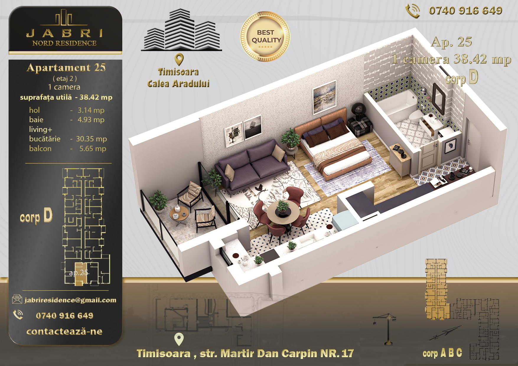 În Jabri Nord Residence, studioul cu 1 cameră este ideal pentru cei care își doresc un stil de viață urban, ordonat și conectat la tot ce contează. Spațiul este inteligent compartimentat, cu o zonă de zi generoasă, bucătărie practică, baie complet utilată și o terasă unde poți evada din ritmul cotidian. Ferestrele mari tip floor to ceiling inundă interiorul cu lumină naturală și creează o atmosferă aerisită și primitoare.