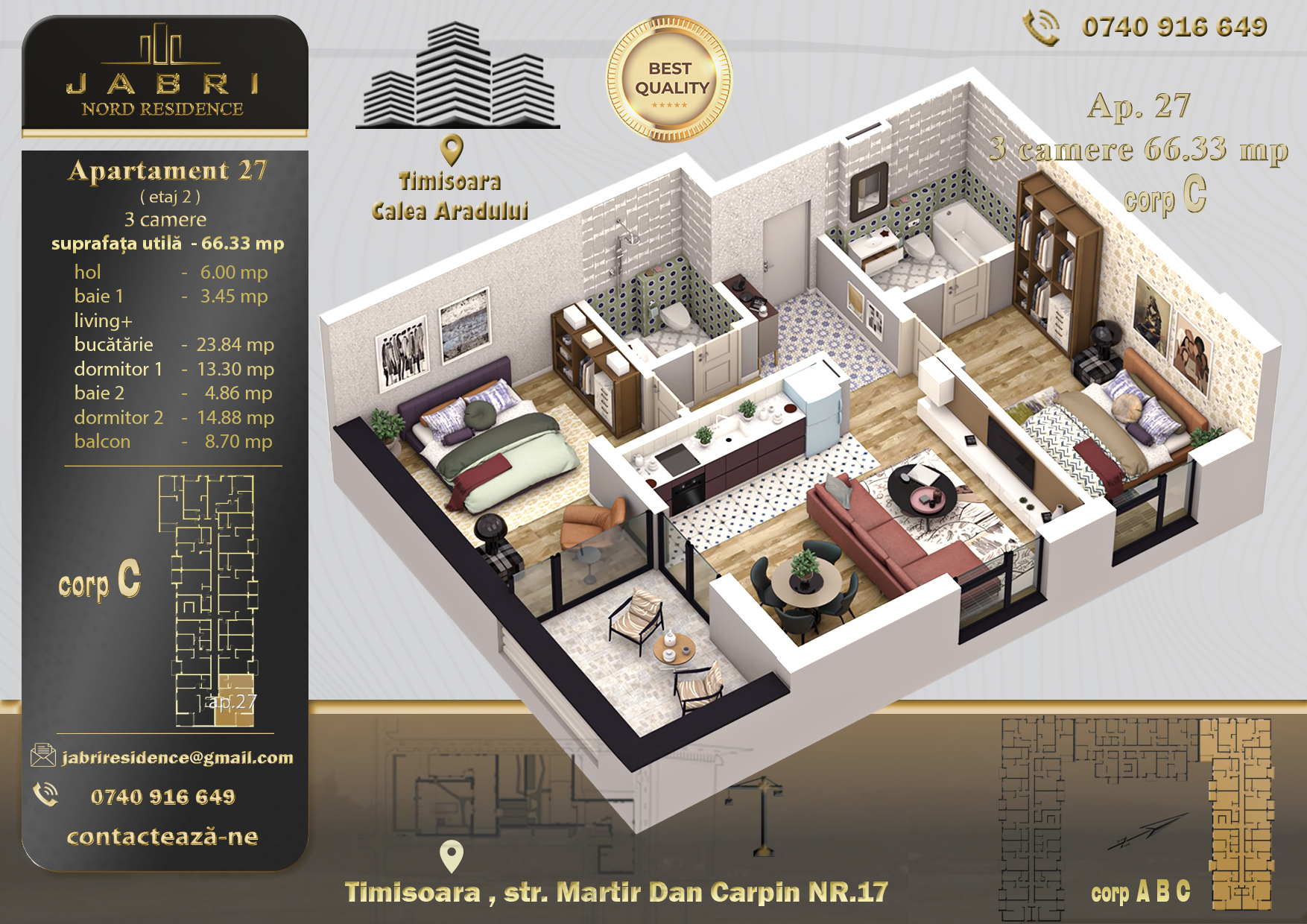 Gândit pentru familii sau pentru cei care își doresc mai mult spațiu, apartamentul cu 3 camere din Jabri Nord Residence te întâmpină cu un ambient generos și luminos. Cele două dormitoare, livingul primitor, bucătăria complet echipată și cele două băi bine gândite îți oferă confortul unei case adevărate. Iar terasa? Un colț de liniște doar al tău, perfect pentru seri în familie sau momente de relaxare la finalul zilei.