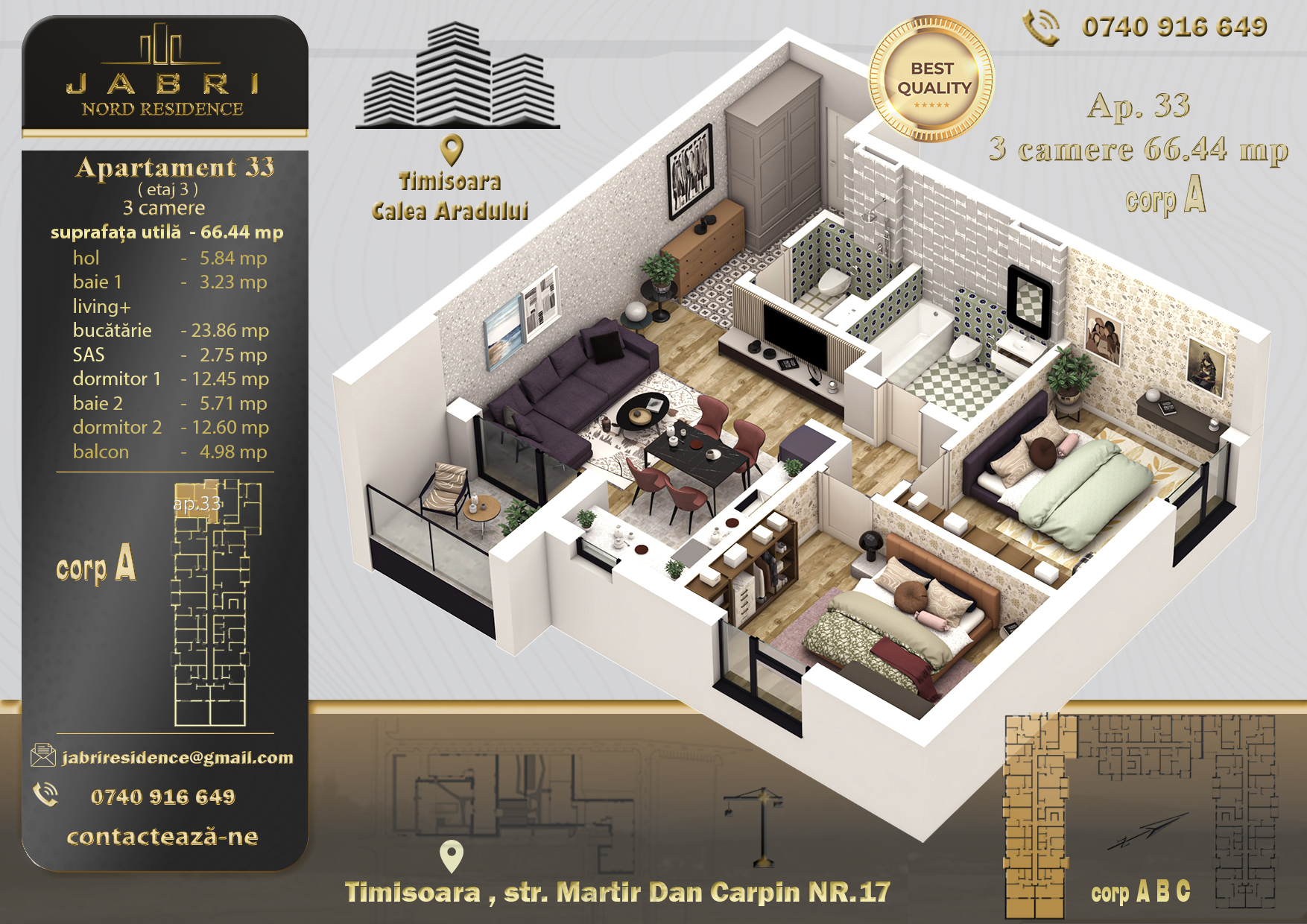 Gândit pentru familii sau pentru cei care își doresc mai mult spațiu, apartamentul cu 3 camere din Jabri Nord Residence te întâmpină cu un ambient generos și luminos. Cele două dormitoare, livingul primitor, bucătăria complet echipată și cele două băi bine gândite îți oferă confortul unei case adevărate. Iar terasa? Un colț de liniște doar al tău, perfect pentru seri în familie sau momente de relaxare la finalul zilei.