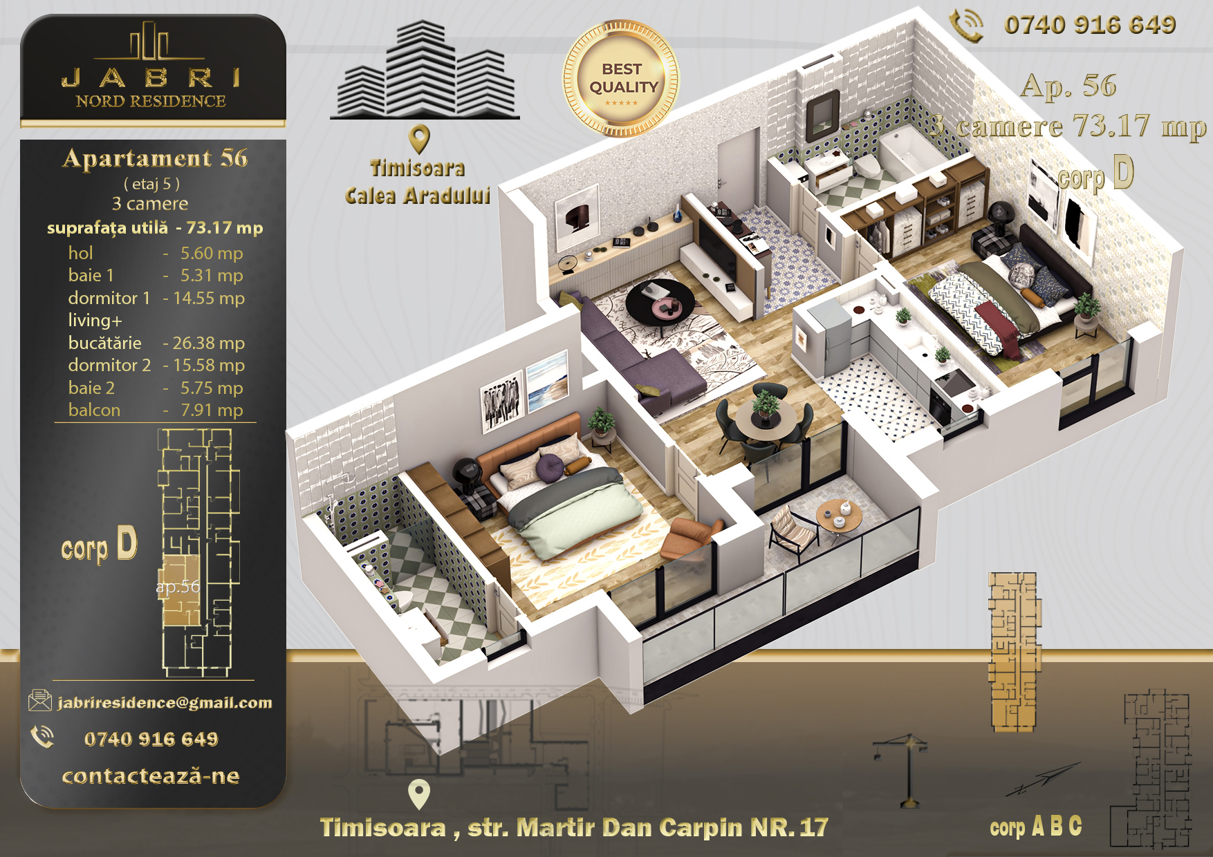 Gândit pentru familii sau pentru cei care își doresc mai mult spațiu, apartamentul cu 3 camere din Jabri Nord Residence te întâmpină cu un ambient generos și luminos. Cele două dormitoare, livingul primitor, bucătăria complet echipată și cele două băi bine gândite îți oferă confortul unei case adevărate. Iar terasa? Un colț de liniște doar al tău, perfect pentru seri în familie sau momente de relaxare la finalul zilei.