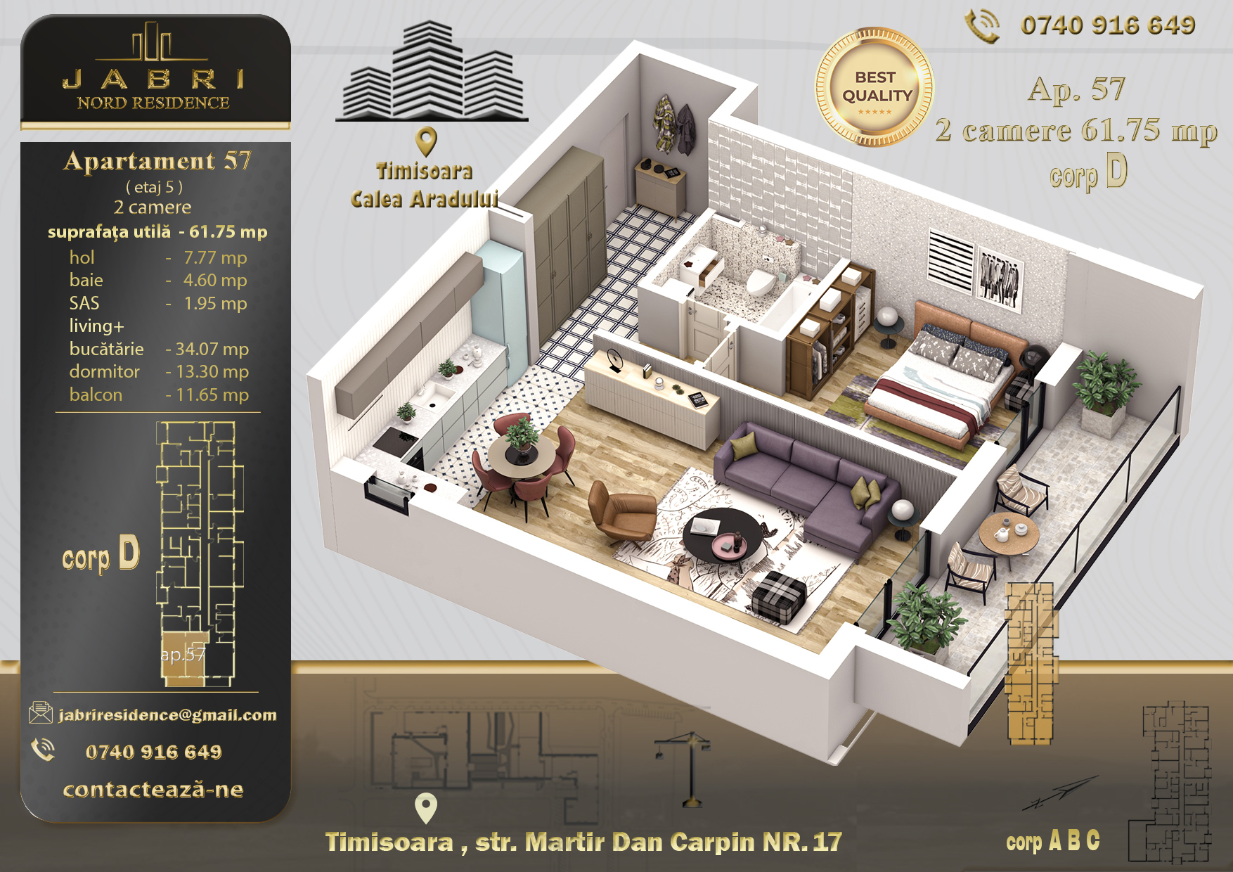 Acest apartament cu 2 camere îmbină perfect funcționalitatea cu confortul. Situat în cadrul Jabri Nord Residence, locuința oferă un living spațios cu deschidere spre o terasă intimă, ideală pentru cafeaua de dimineață sau relaxarea de seară. Dormitorul oferă liniște și intimitate, bucătăria este bine organizată, iar baia impresionează prin finisaje moderne și atenție la detalii.
