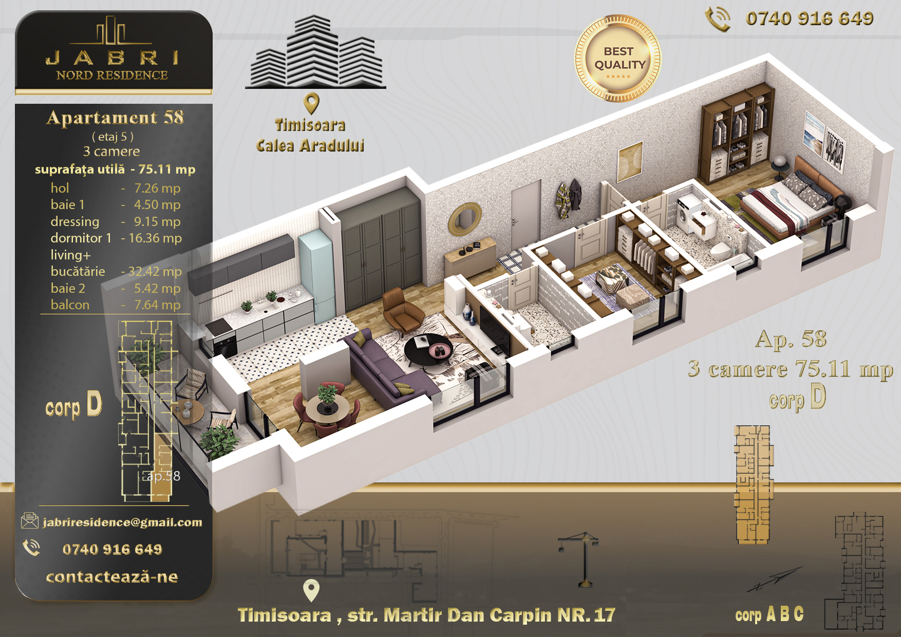 Gândit pentru familii sau pentru cei care își doresc mai mult spațiu, apartamentul cu 3 camere din Jabri Nord Residence te întâmpină cu un ambient generos și luminos. Cele două dormitoare, livingul primitor, bucătăria complet echipată și cele două băi bine gândite îți oferă confortul unei case adevărate. Iar terasa? Un colț de liniște doar al tău, perfect pentru seri în familie sau momente de relaxare la finalul zilei.