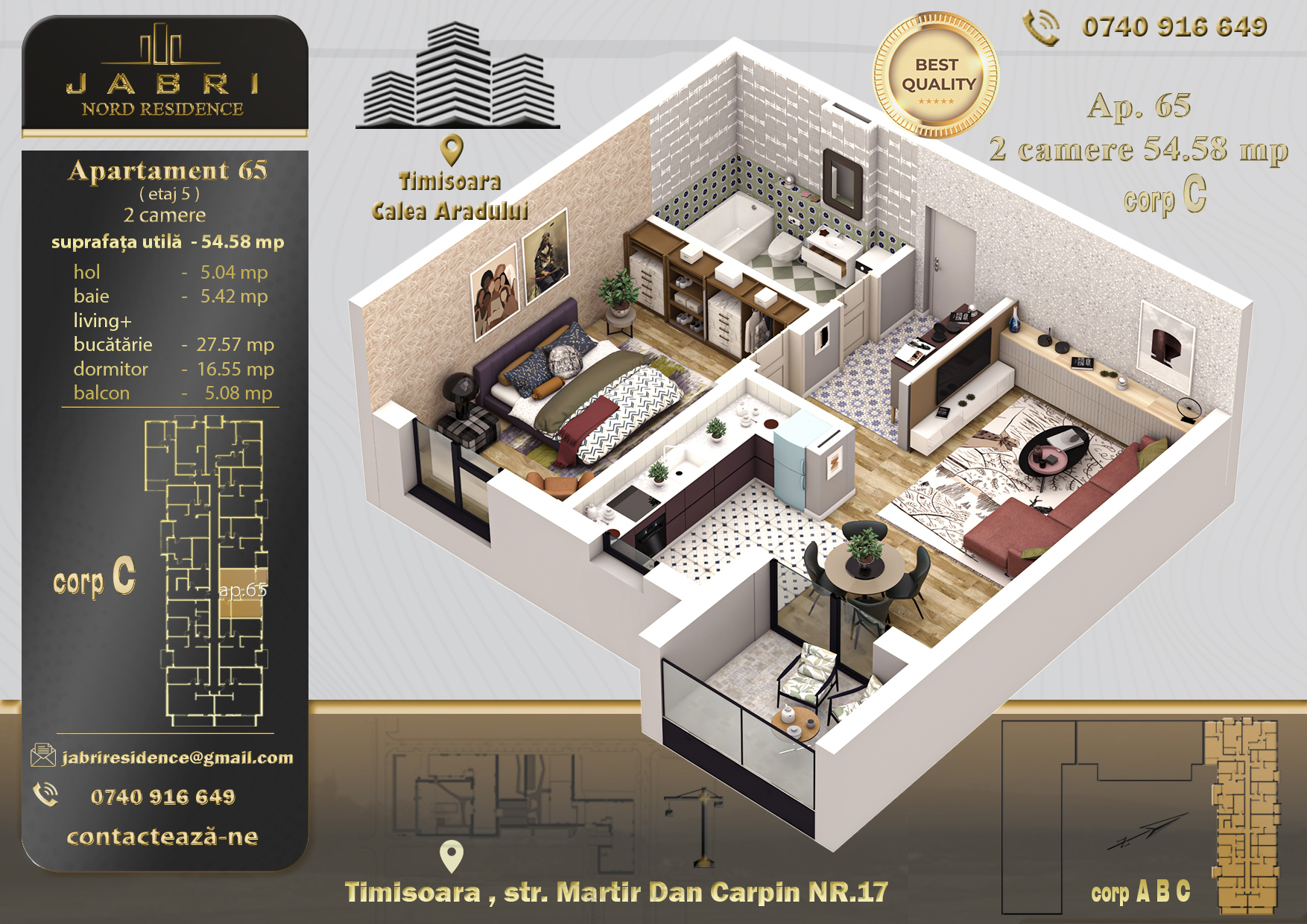 Acest apartament cu 2 camere îmbină perfect funcționalitatea cu confortul. Situat în cadrul Jabri Nord Residence, locuința oferă un living spațios cu deschidere spre o terasă intimă, ideală pentru cafeaua de dimineață sau relaxarea de seară. Dormitorul oferă liniște și intimitate, bucătăria este bine organizată, iar baia impresionează prin finisaje moderne și atenție la detalii.
