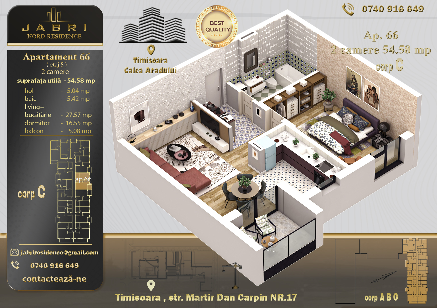 Acest apartament cu 2 camere îmbină perfect funcționalitatea cu confortul. Situat în cadrul Jabri Nord Residence, locuința oferă un living spațios cu deschidere spre o terasă intimă, ideală pentru cafeaua de dimineață sau relaxarea de seară. Dormitorul oferă liniște și intimitate, bucătăria este bine organizată, iar baia impresionează prin finisaje moderne și atenție la detalii.